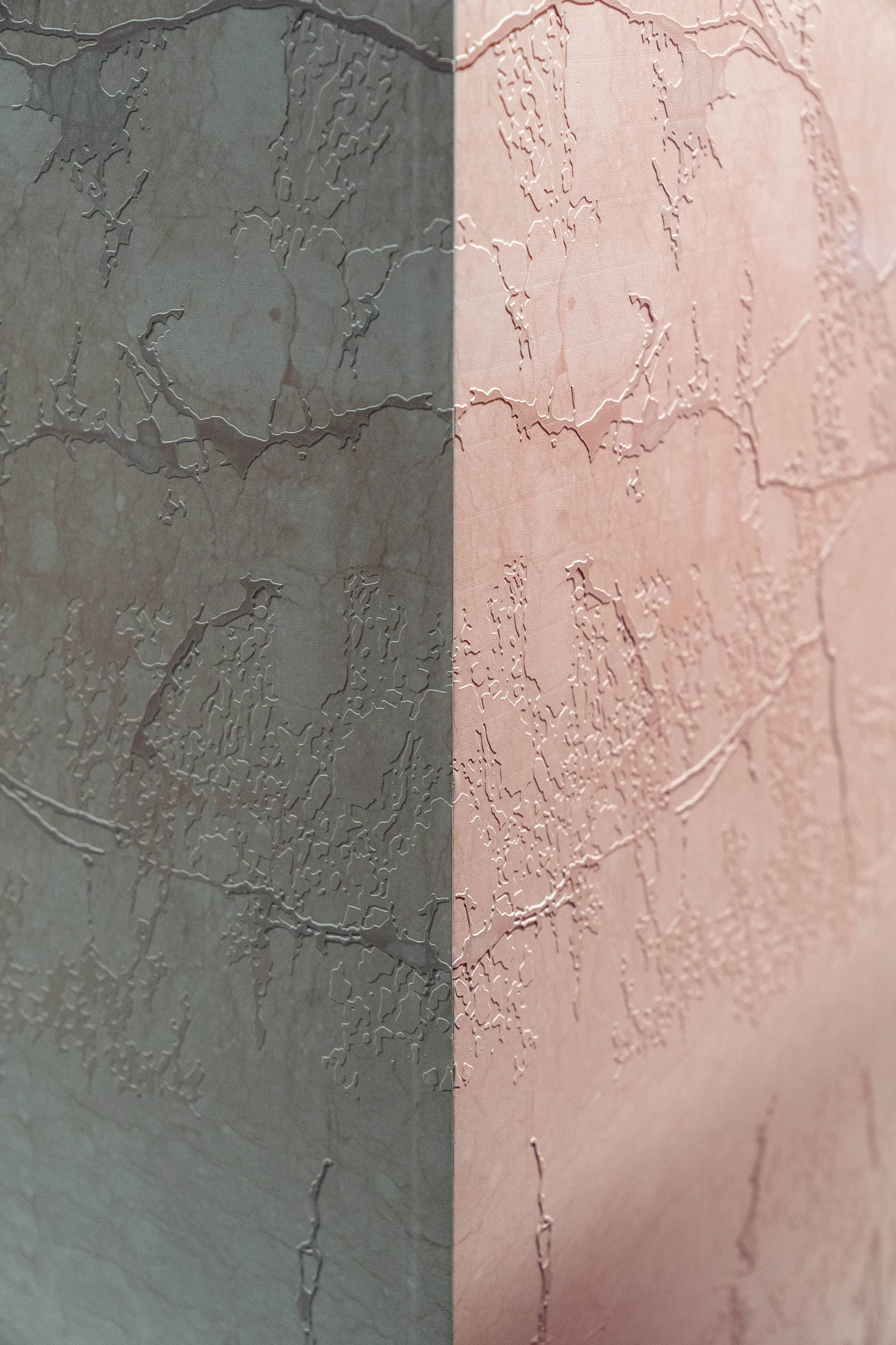 This window embraced those values with a clean, minimal approach, using textured vinyls inspired by natural materials like sandstone and limewash. The soft, neutral tones created a calm, considered backdrop that highlighted the contrast of dark leather and metal finishes of the product.